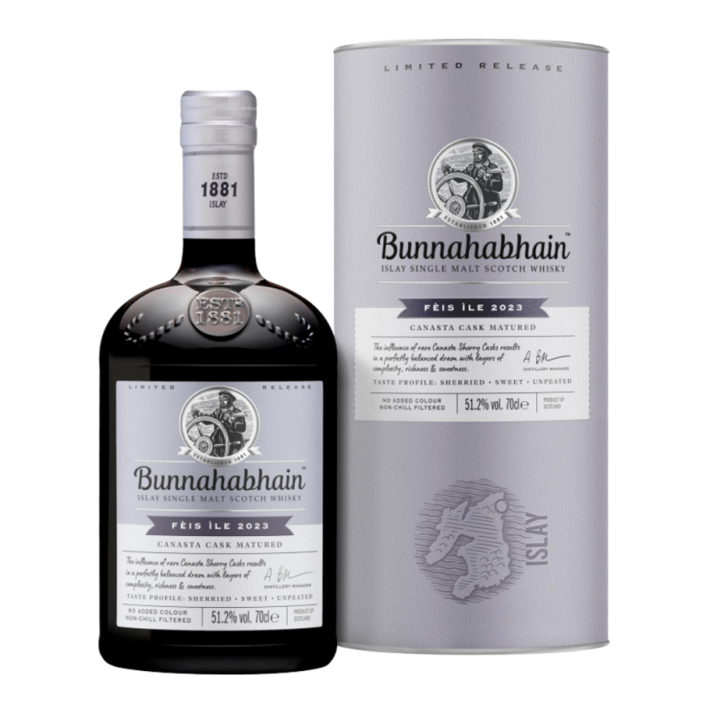 Bunnahabhain Canasta Cask Matured to limitowana edycja z okazji największego święta fanów whisky na całym świecie, Feis lle (festiwalu whisky na wyspie Islay). Podczas tego święta fani whisky „pielgrzymują” na wyspę, aby dobrze się bawić i spróbować limitowanych edycji specjalnie przygotowanych na tę okazję. Teraz Bunnahabhain Canasta Feis Ile edycja 2023 możemy degustować również w Polsce. Canasta Casks to bardzo rzadkie beczki, które umożliwiają nadanie whisky wielowymiarowego smaku poprzez połączenie wytrawnych orzechowych nut Oloroso sherry ze słodszymi kremowo owocowymi nutami Pedro Ximenez. Bunnahabhain to whisky o naturalnym kolorze, niefiltrowana na zimno, aby zachować bogaty autentyczny wygląd, aromat i smak. Zapach karmelizowanych owoców, prażonych orzechów w ustach suszone figi, dojrzałe gruszki z nutą skórki pomarańczy, oleista whisky o długim, deserowym finiszu budyniu waniliowego i subtelnej mgle soli morskiej.