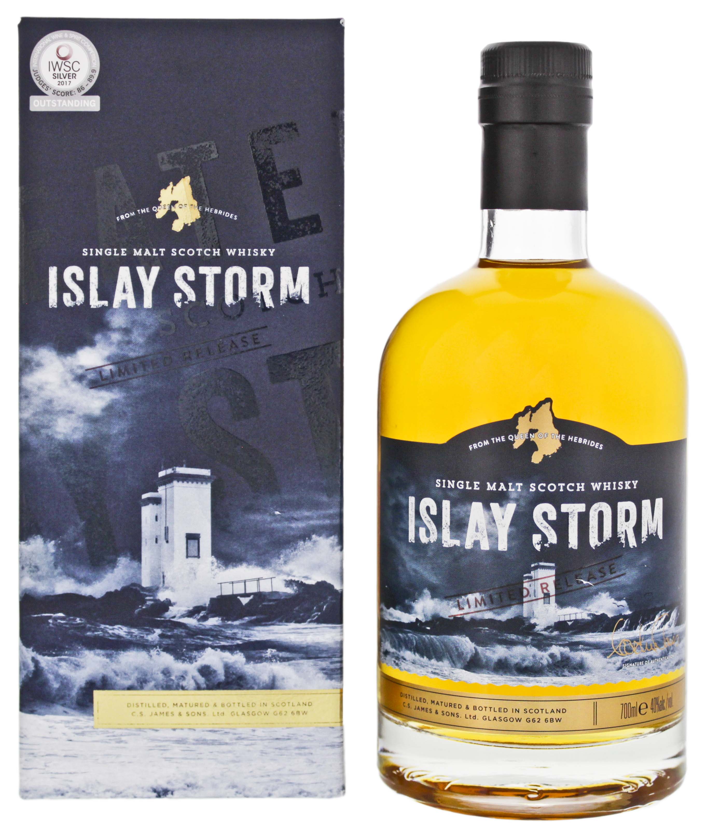 Islay Storm to szkocki single malt whisky butelkowany z klasyczną mocą alkoholu 40%. Produkt ten świetnie oddaje esencję wyjątkowej i tajemniczej energii, która otacza słynną wyspę Islay. Islay Storm, single malt z nieujawnionej destylarni, ma dużo torfowego charakteru, charakterystycznego dla wyspy, z której pochodzi.