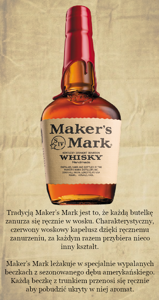 Tradycją Maker’s Mark jest to, że każdą butelkę zanurza się ręcznie w wosku. Charakterystyczny, czerwony woskowy kapelusz dzięki ręcznemu zanurzeniu, za każdym razem przybiera nieco inny kształt.