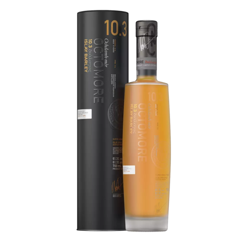 Poznaj wyjątkową whisky Bruichladdich Octomore 10.3, która jest symbolem innowacyjności i jakości destylarni Bruichladdich. Ta edycja Octomore, wydestylowana w 2013 roku, dojrzewała przez sześć lat w beczkach po amerykańskim bourbonie. Wykonana z jęczmienia uprawianego na jednej farmie na Islay, Octomore 10.3 charakteryzuje się terroir, które nadaje jej unikalny profil smakowy. Zawartość alkoholu wynosząca 61,3% sprawia, że ta whisky jest intensywna i pełna charakteru. W aromacie można wyczuć nuty torfu, cytryny, tymianku, morskiej soli, wanilii i karmelu. Na podniebieniu dominują smaki soli, miodu, cytryny, gruszki, agrestu oraz dębu, a tło stanowi ciężki dym torfowy. Finisz jest słodki, z nutami ciasta i czekolady, które przechodzą w gorzkie akcenty dymu i przypraw.
