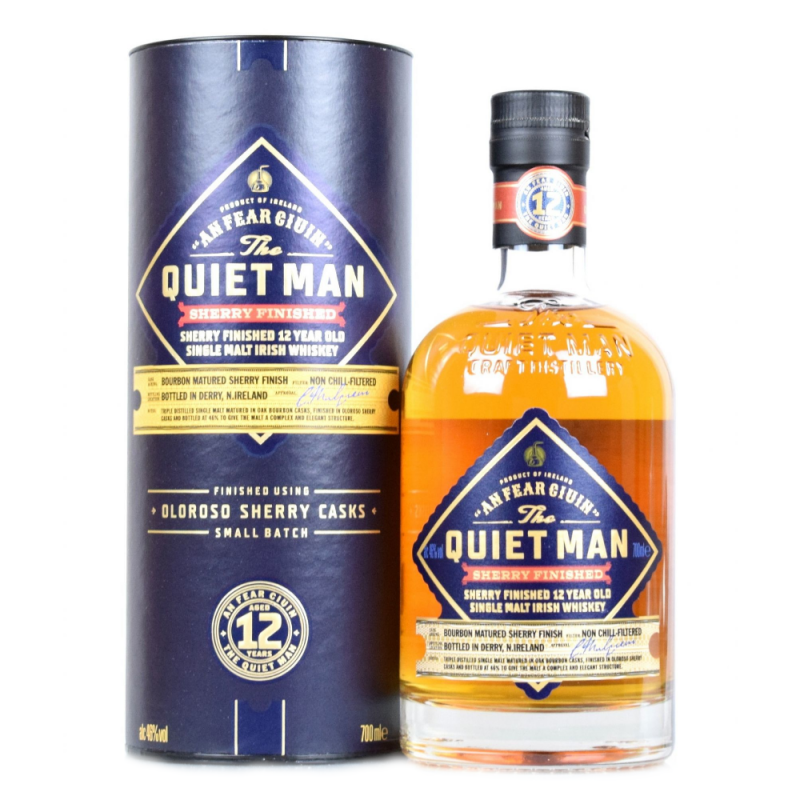 The Quiet Man Sherry Finished to irlandzki single malt potrójnie destylowany, początkowo dojrzewający w beczkach po bourbonie, a finiszujący maturację w beczkach po wytrawnej i gładkiej sherry Oloroso. Taki zabieg nadaje trunkowi charakterystycznych, owocowych elementów. Nieinwazyjny i delikatny melonowy aromat idzie w parze z trawiastym smakiem o nutach jabłkowych i czekoladowych. Irlandzka whiskey stanowi jedną z wielu pozycji małej, lokalnej marki Niche Drinks, współpracującej z ogromną, amerykańską firmą Luxco dystrybuującą alkohole na cały świat. Trunek od 2016 roku wytwarzany jest w destylarni w mieście Derry w Szkocji. Co ciekawe, jest to pierwszy alkohol z tamtych terenów produkowany od około 150 lat! Przed budową własnej destylarni, złoty single malt wytwarzano w gorzelni Cooley należącej do Kilbeggan Distilling Company.